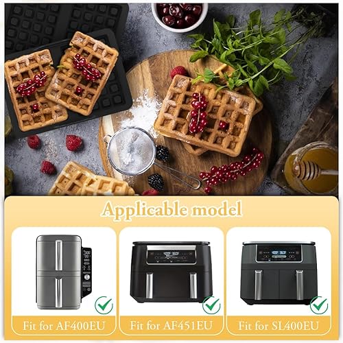 Le lot de 2 moules à gaufres en silicone HOTUT est spécialement conçu pour friteuses à air, incluant les modèles Ninja Dual Air Fryer AF400UK et AF451UK. Ces moules réutilisables noirs permettent de préparer des gaufres parfaitement cuites dans votre friteuse à air, offrant une solution pratique et durable pour diversifier vos recettes.