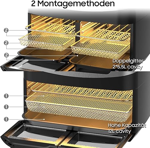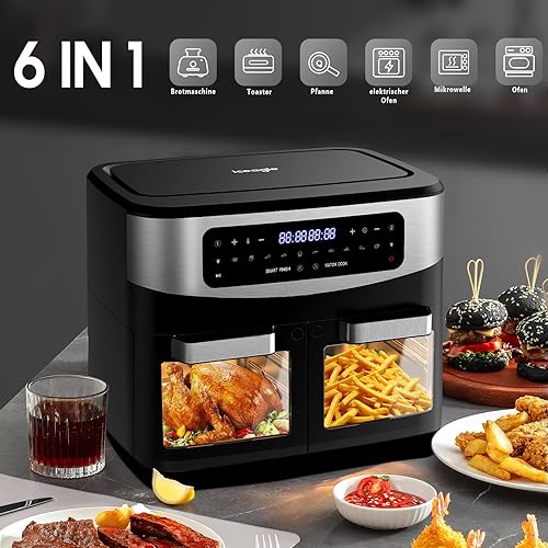 La friteuse à air chaud Iceagle de 12 litres et 2600 W possède deux compartiments indépendants pour cuire plusieurs plats simultanément.