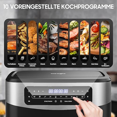 La friteuse sans huile Iceagle de 12 litres offre une cuisson à air chaud efficace avec 10 programmes intégrés. Équipée de deux tiroirs indépendants, d’une fenêtre visible et d’un panneau tactile LED, elle intègre les fonctions Match Cook et Smart Cook pour une expérience culinaire intelligente.