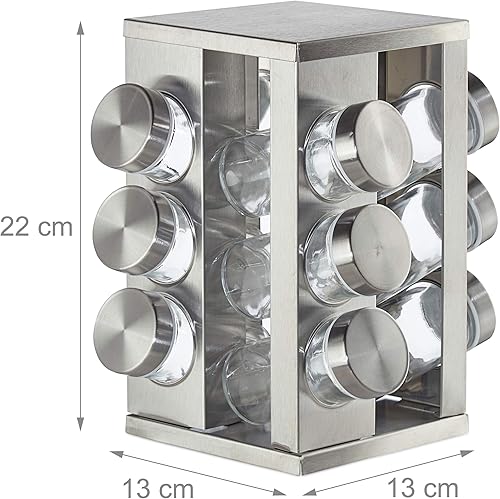 Tourniquet à épices Relaxdays comprenant 12 pots en verre, présenté sur une étagère rotative à 360° en acier inoxydable. Ses dimensions compactes de 22 x 19 cm (hauteur x diamètre) et sa finition argentée en font un accessoire pratique et élégant pour organiser votre cuisine.