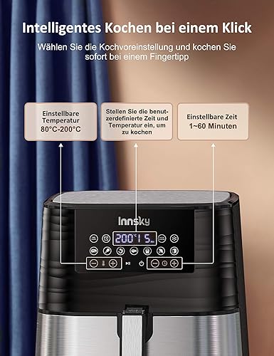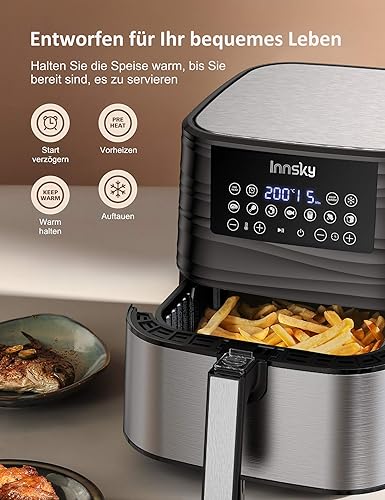 La friteuse à air chaud Innsky XXL de 5,5 litres et 1700 W dispose d’un écran tactile LED numérique et propose 7 programmes automatiques. Elle inclut des fonctions de préchauffage, maintien au chaud et décongélation, permettant une cuisson sans huile optimale.