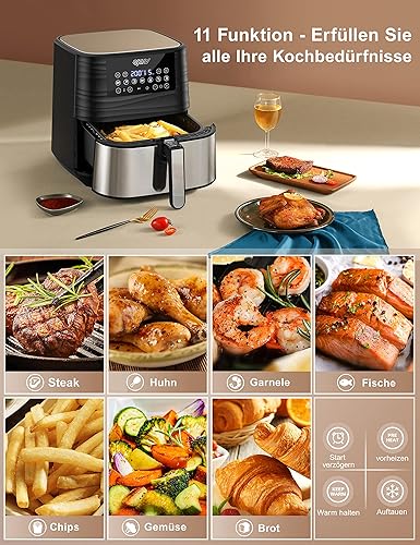 L’interface LED intègre 7 programmes prédéfinis, un contrôle précis de la température (80-200 °C), un réglage jusqu’à 60 minutes, ainsi qu’une fonction de réservation allant jusqu’à 12 heures, facilitant la préparation de vos plats favoris.
