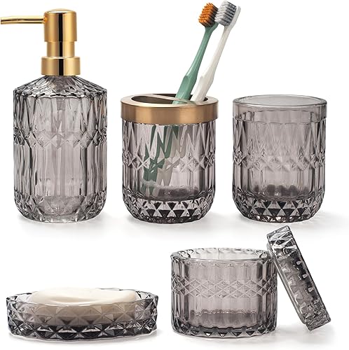 Le lot IVAILEX comprend 5 accessoires de salle de bain en verre gris : un distributeur de lotions, un porte-savon, un porte-brosse à dents, un verre et un pot pour bâtons de coton.