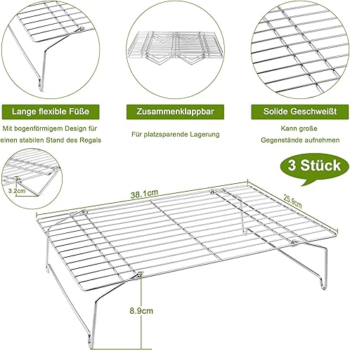 Joyfair Grille de refroidissement en acier inoxydable à 3 étages - Rectangulaire - Empilable - Pour biscuits, pain et pizza - Pliable et empilable - Passe au lave-vaisselle - 38,1 x 25,9 cm