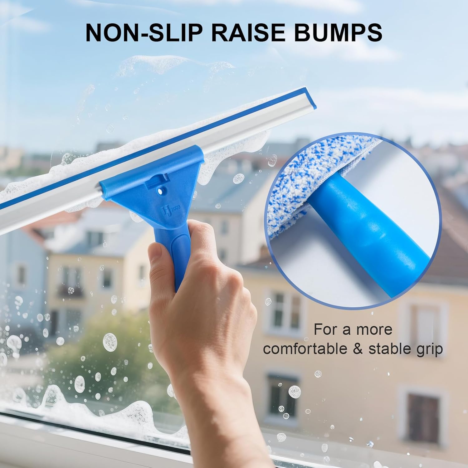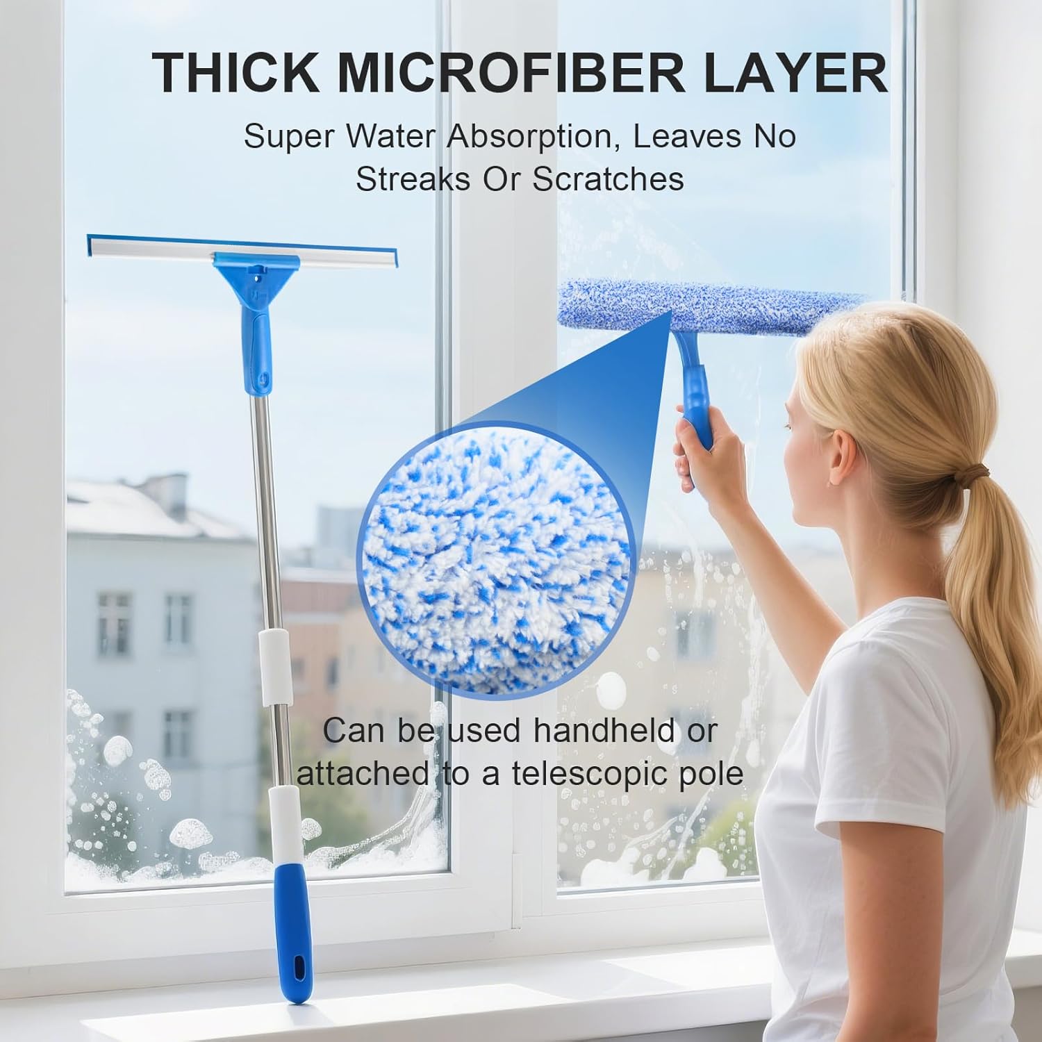 Compatible avec manches télescopiques pour atteindre facilement vos fenêtres en hauteur et baies vitrées.