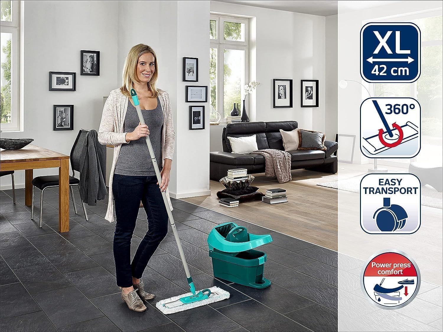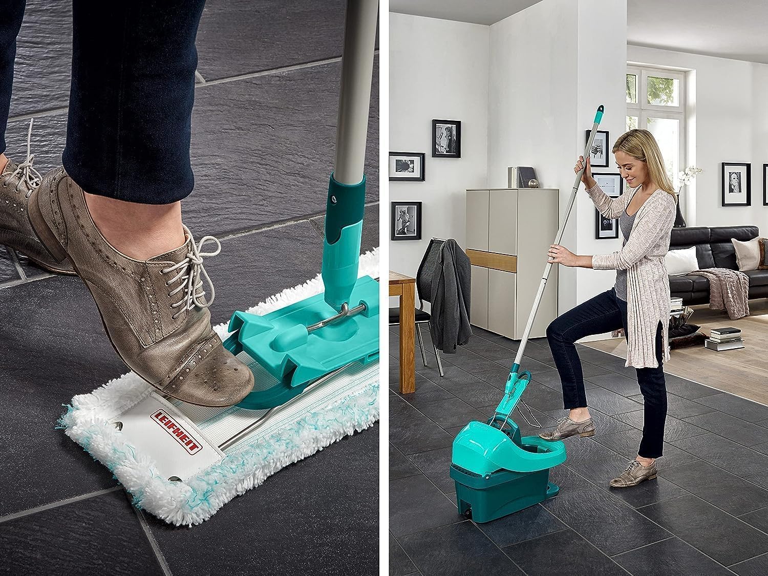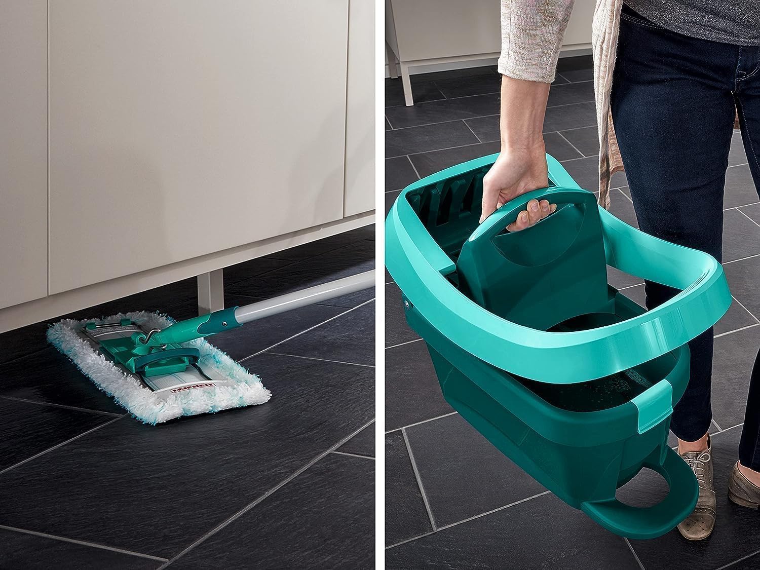 Le kit de nettoyage Leifheit Profi XL comprend un lave-sol micro duo avec un manche en acier en trois parties, un seau avec essorage par pression au pied et un support roulant facilitant le transport.
