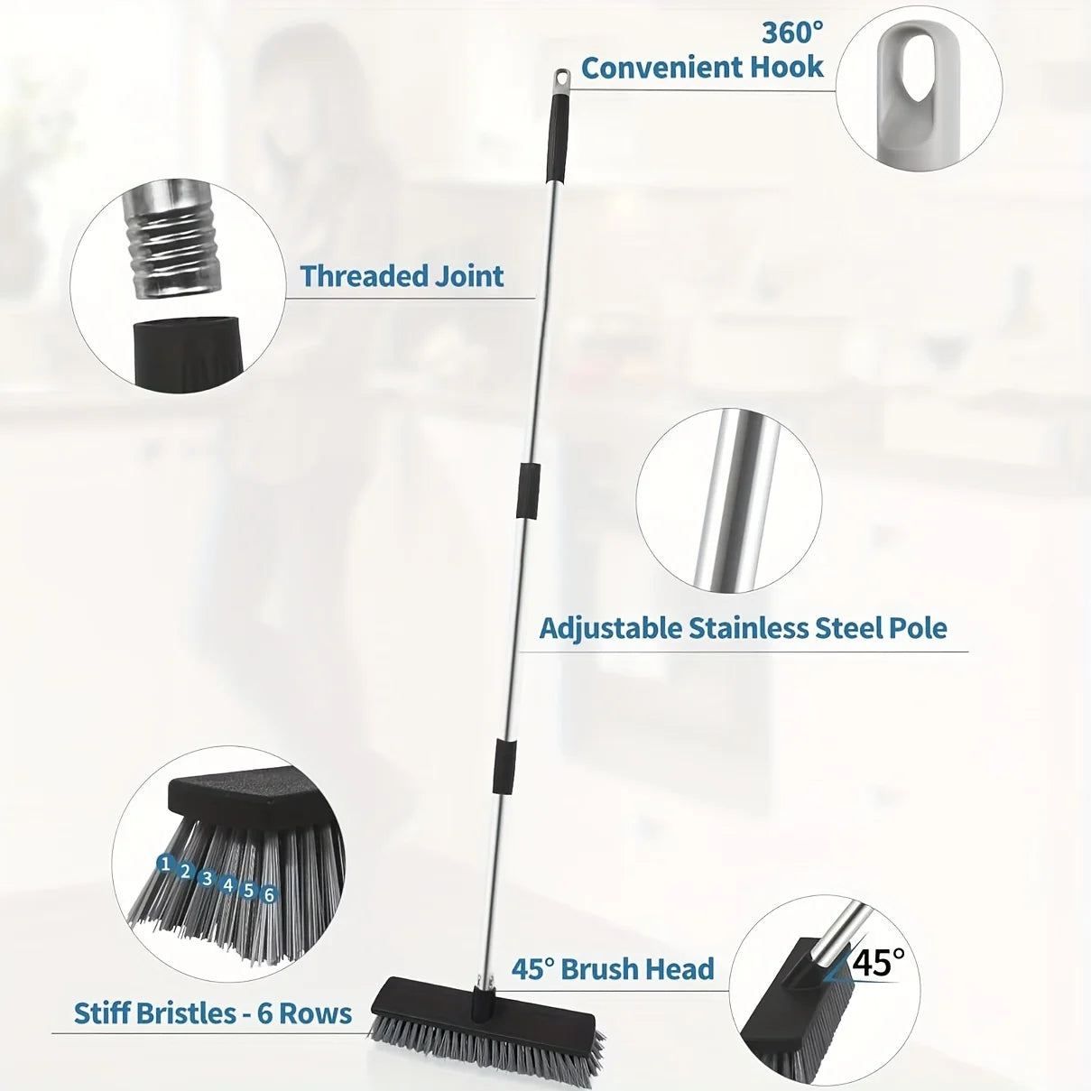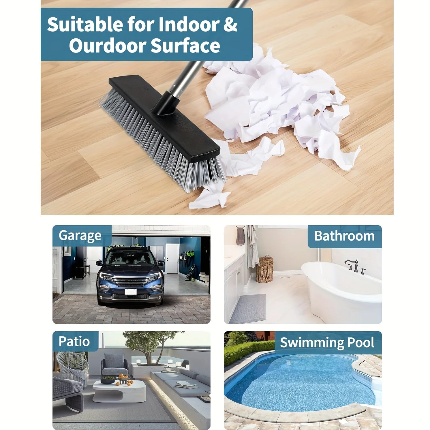 Large Hard Bristle Broom, Wooden Floor Washer, Adjustable Multi-Section Long Handle, Concrete Push Broom Outdoor Garage Broom
