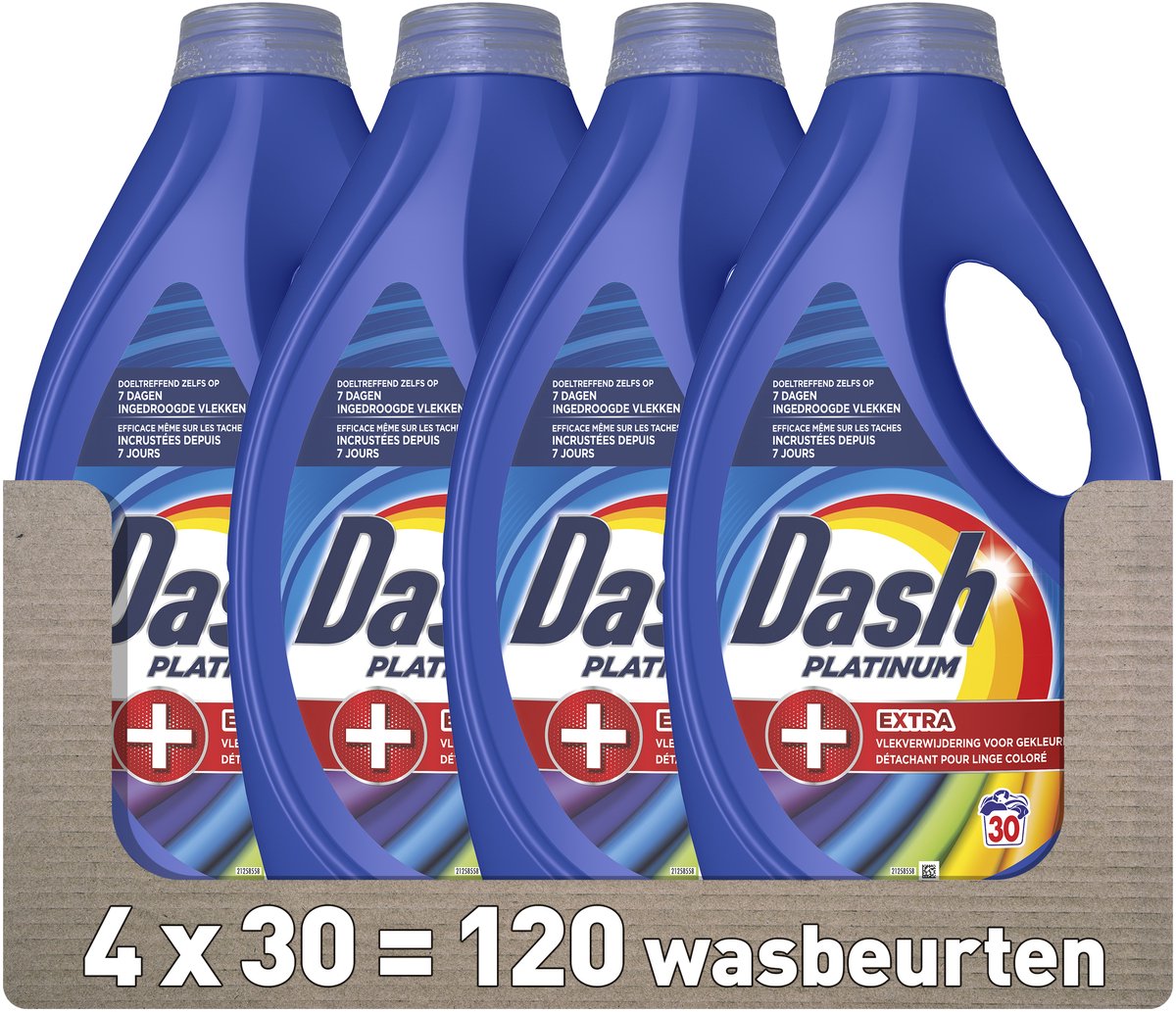 Pack de 4 lessives liquides Dash Platinum enrichies d’un détachant puissant, spécialement formulées pour le linge coloré, offrant jusqu’à 120 cycles de lavage.