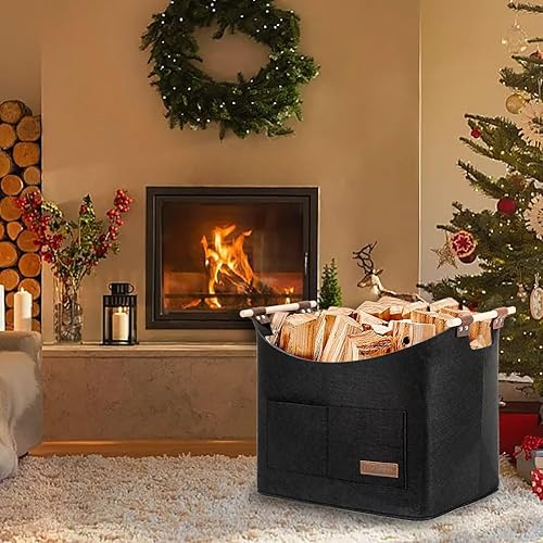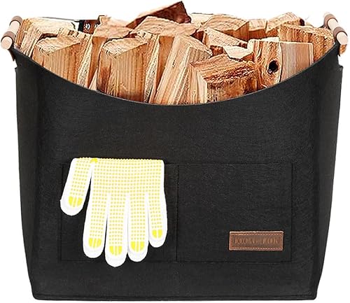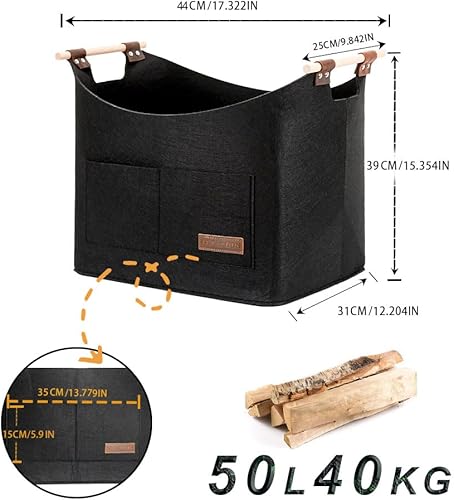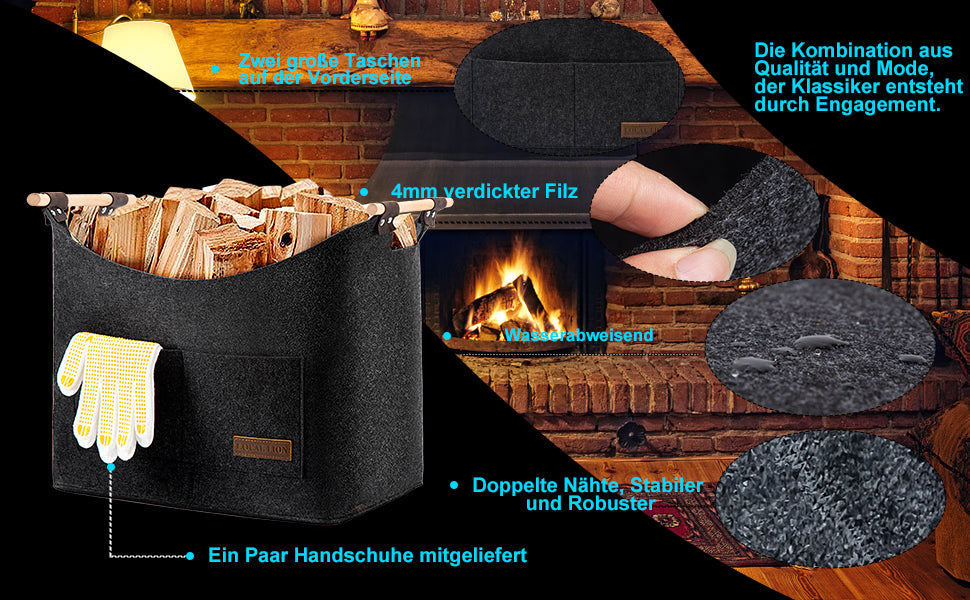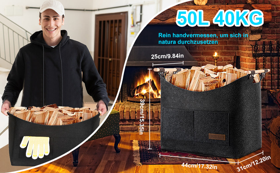 Panier en feutre léger d'une taille suffisante de 50 l : on peut transporter 40 kg de bois, selon le type de bois. Ainsi, il peut contenir suffisamment de bois pour 1 à 2 soirées près de la cheminée. À l'avant, il y a deux petites poches supplémentaires, ce qui peut être utilisé pour les petites choses.