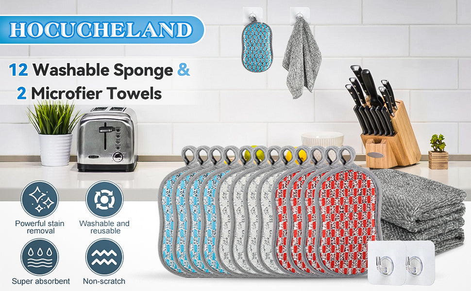 Ensemble de 12 éponges vaisselle lavables en microfibre, comprenant également 2 chiffons de nettoyage et 2 crochets.