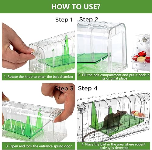 Lot de 2 pièges à souris vivants réutilisables, conçus en polycarbonate durable, sans recours aux poisons pour une capture sécurisée. Parfaits pour une utilisation dans la cuisine, le salon ou l’entrepôt, ils mesurent 17,2 x 6,5 x 6,8 cm et garantissent une gestion efficace et respectueuse des souris.