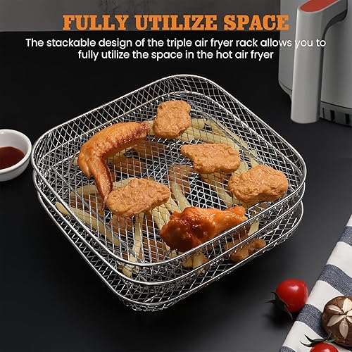 Ensemble de 3 racks empilables pour friteuse à air, fabriqués en acier inoxydable, compatibles avec friteuses à air chaud. Ce kit d’accessoires inclut également 2 pinces pour une manipulation facile et sécurisée des aliments.