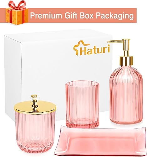 Ce lot de 4 accessoires de salle de bain en verre rose comprend un distributeur de savon lotion, un plateau pour coiffeuse, un pot d'apothicaire et un porte-brosse à dents, parfaits pour organiser vos produits de toilette ou cosmétiques.