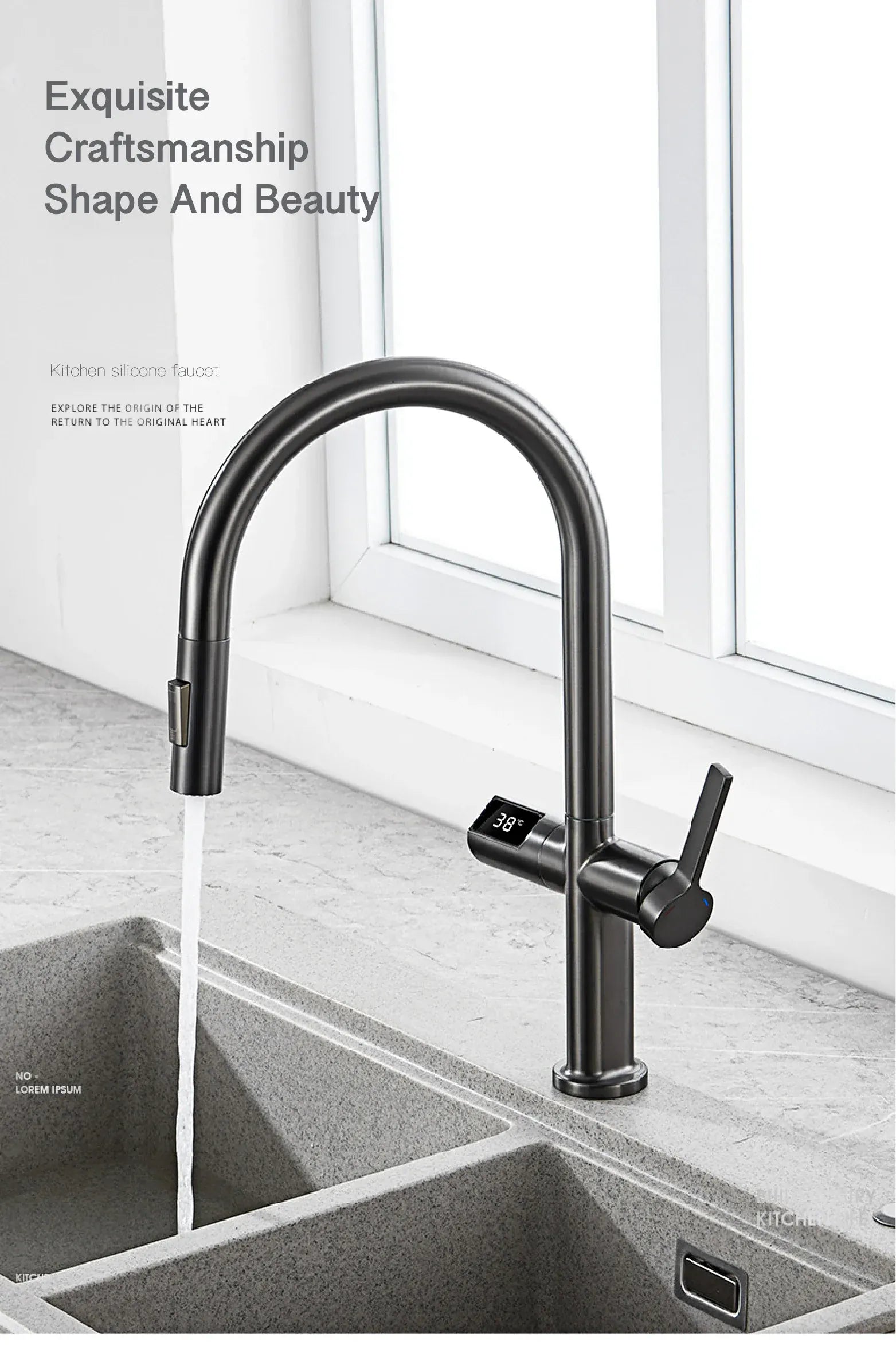 Luxury brass gun gray kitchen faucet LED digital sensing design single handle hot & cold water pull-out type 2-function sink Tap
