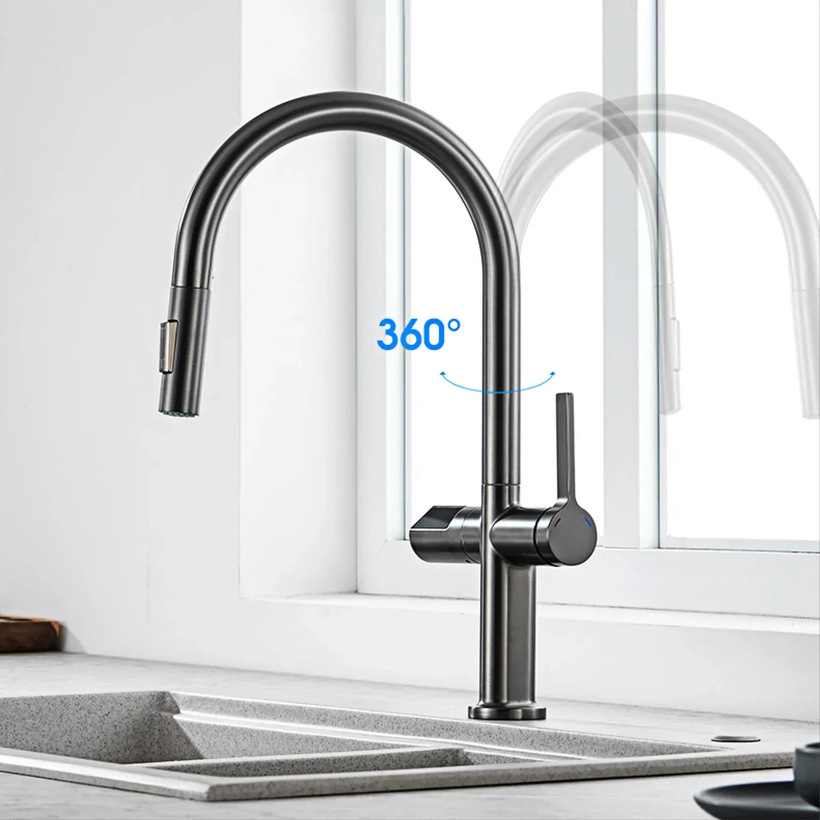 Luxury brass gun gray kitchen faucet LED digital sensing design single handle hot & cold water pull-out type 2-function sink Tap