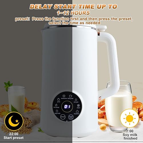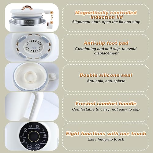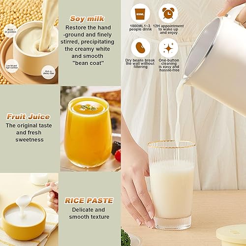 Machine à lait végétal de 1 litre dotée d’un écran LED et d’une minuterie intégrée. Cette machine polyvalente prépare efficacement le lait de noix, de soja et les soupes, tout en offrant des fonctions d’auto-nettoyage et de maintien au chaud, sans nécessiter de filtre.
