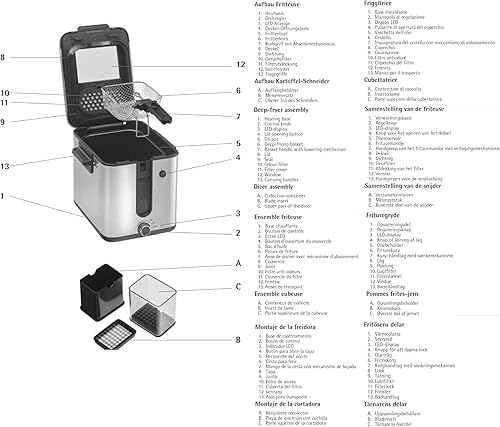 Le panier, manipulable par une poignée pliable, facilite le levage et le rangement compact de l’appareil. Un filtre anti-odeurs intégré dans le couvercle réduit les nuisances lors de la cuisson, tandis que les éléments tels que le réservoir d’huile enduit, le couvercle avec joint et le filtre sont compatibles lave-vaisselle, assurant un entretien simple et rapide.
