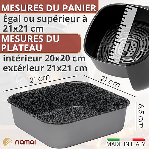 La plaque de cuisson NAMAI pour friteuse à air carrée mesure 20 x 20 cm et est conçue en aluminium avec un revêtement effet pierre. Compatible avec le lave-vaisselle, elle peut également être utilisée au four, offrant une solution pratique et durable pour vos préparations culinaires.