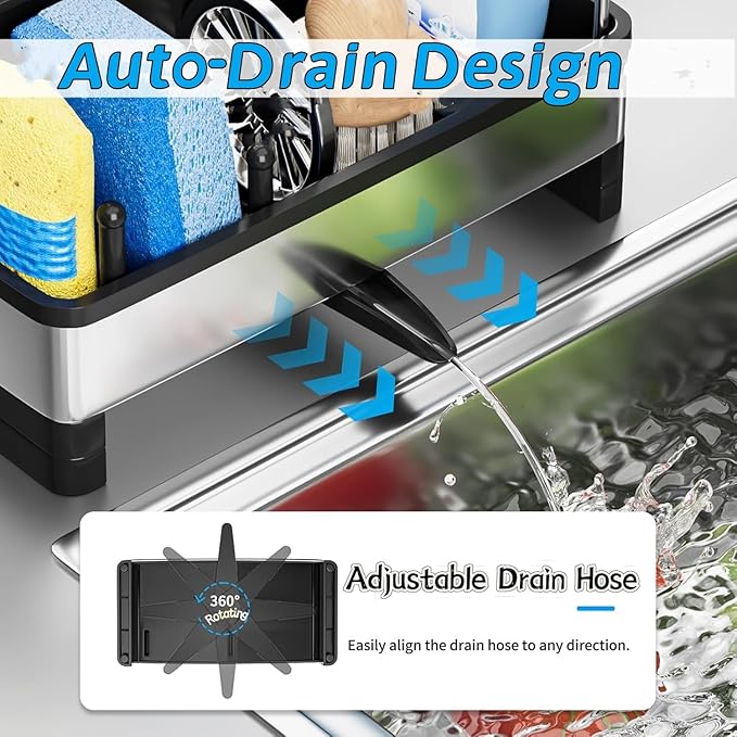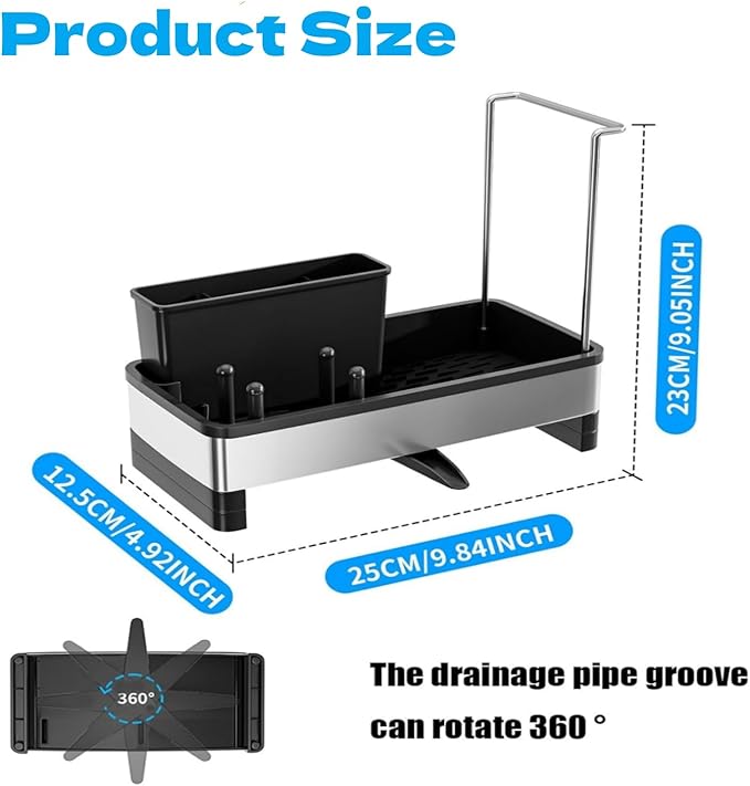 Cet organisateur d’évier de cuisine offre un système de vidange réglable à 360° pour évacuer l’eau efficacement et éviter les accumulations.