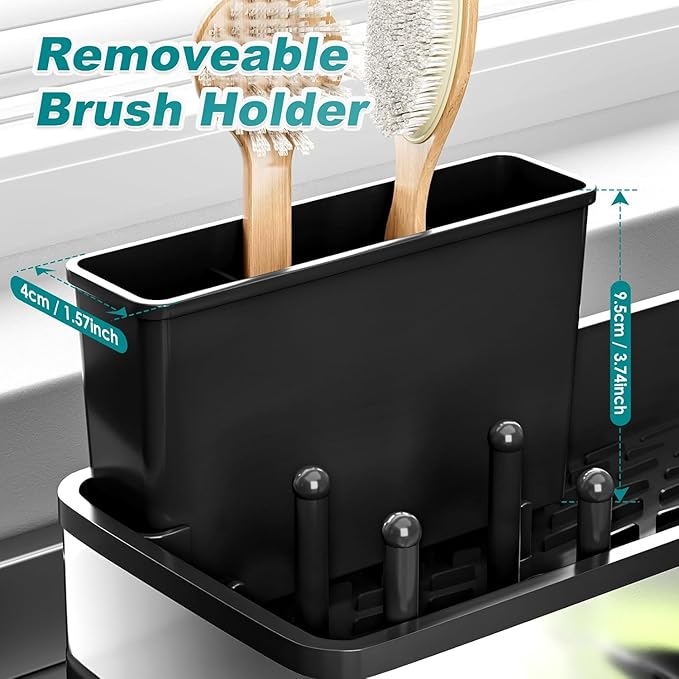 Organisateur d’évier avec bac de drainage automatique, porte-éponge et porte-serviettes, conçu pour optimiser le rangement et l’organisation dans la cuisine (noir).