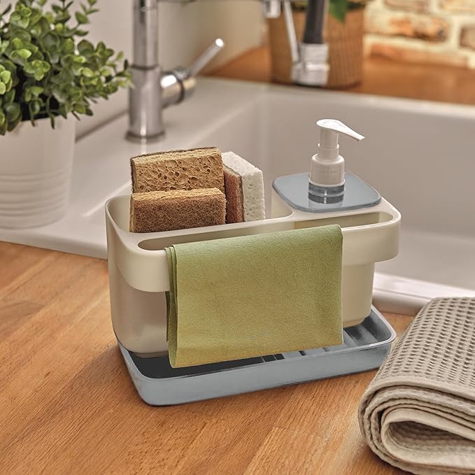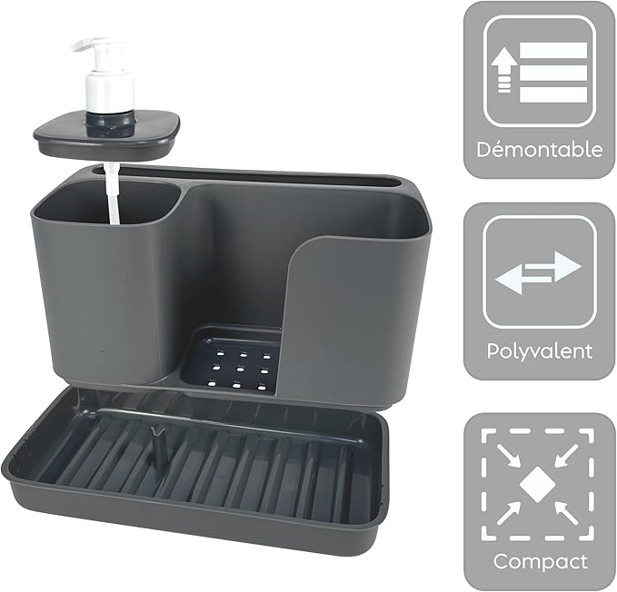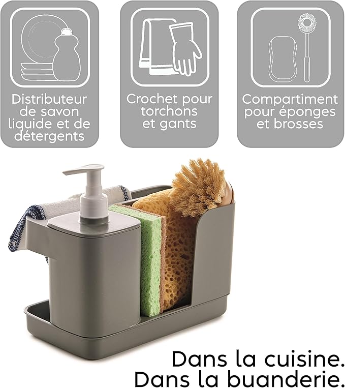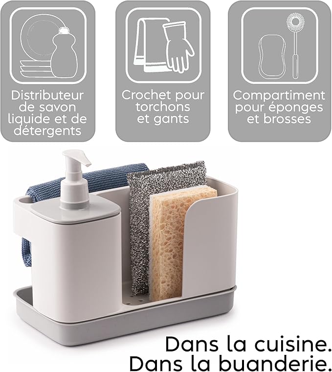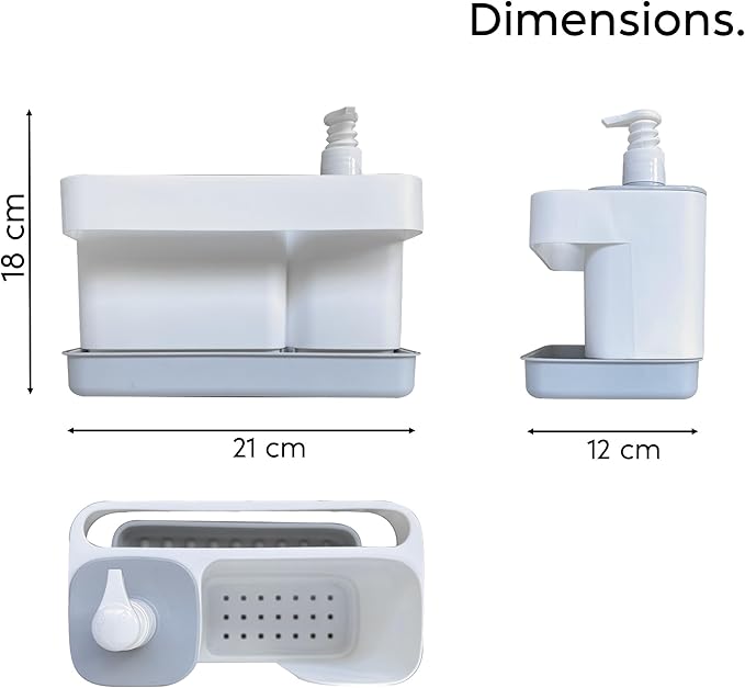 Organisateur d’évier multifonctionnel avec distributeur intégré, idéal pour ranger votre éponge. Dimensions : 21 x 12 x 18 cm. Conçu en Italie pour optimiser l’espace de votre évier de cuisine.