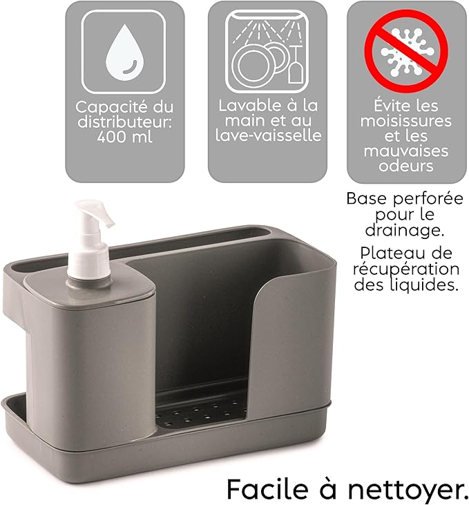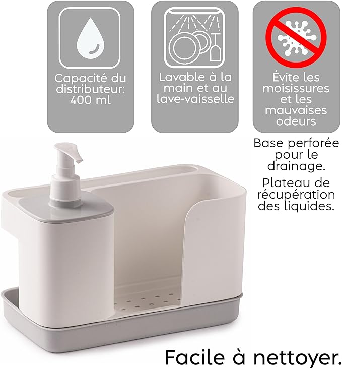 HYGIÉNIQUE : Conçu pour faciliter le séchage des éponges, serviettes et gants, ce modèle possède un fond perforé et un plateau récupérateur de liquide, réduisant ainsi les risques de moisissures et d’odeurs désagréables.