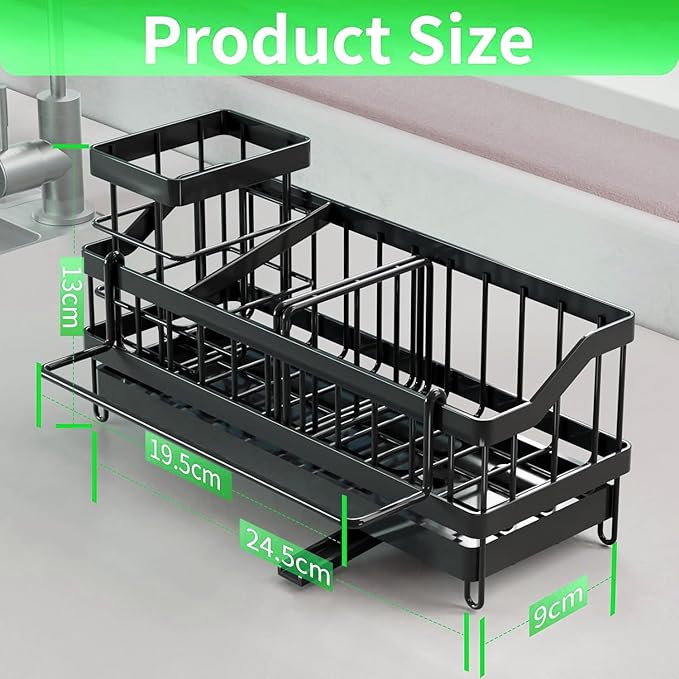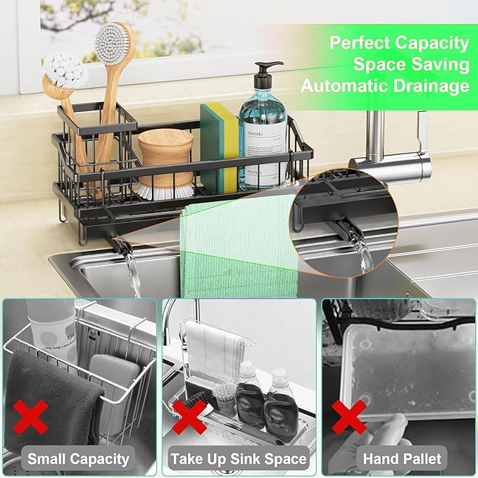 Organisateur d'évier de cuisine doté d’un porte-éponge avec système de vidange automatique.
