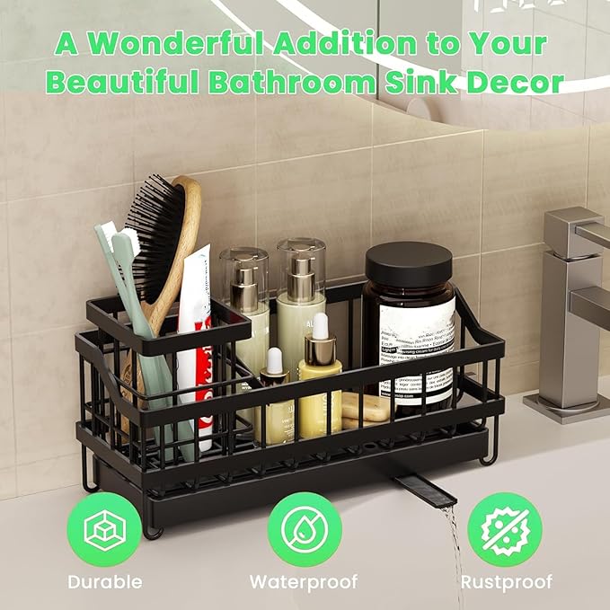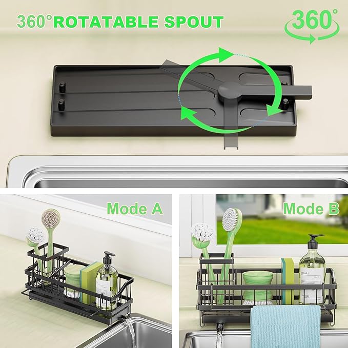 Organisateur d’évier compact en acier inoxydable noir, doté d’un système de drainage automatique avec égouttoir amovible et bec rotatif pour évacuer l’eau directement dans l’évier.