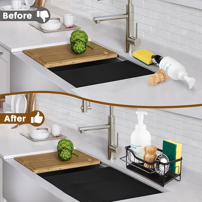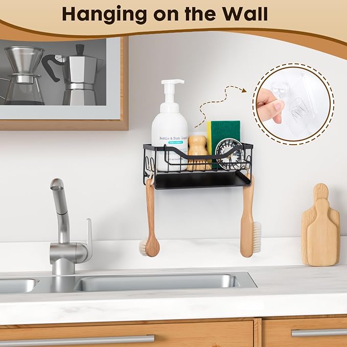 Porte-éponge en acier inoxydable noir pour évier, avec système de vidange automatique pour un rangement propre et pratique.