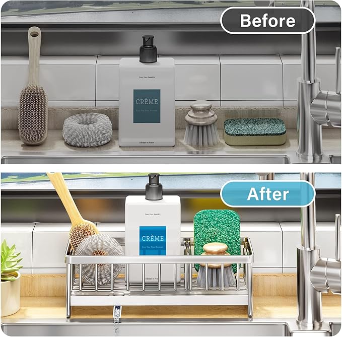 Cet organisateur d’évier multifonction optimise le rangement des éponges, savons, brosses et autres accessoires grâce à sa capacité étendue et sa disposition flexible.