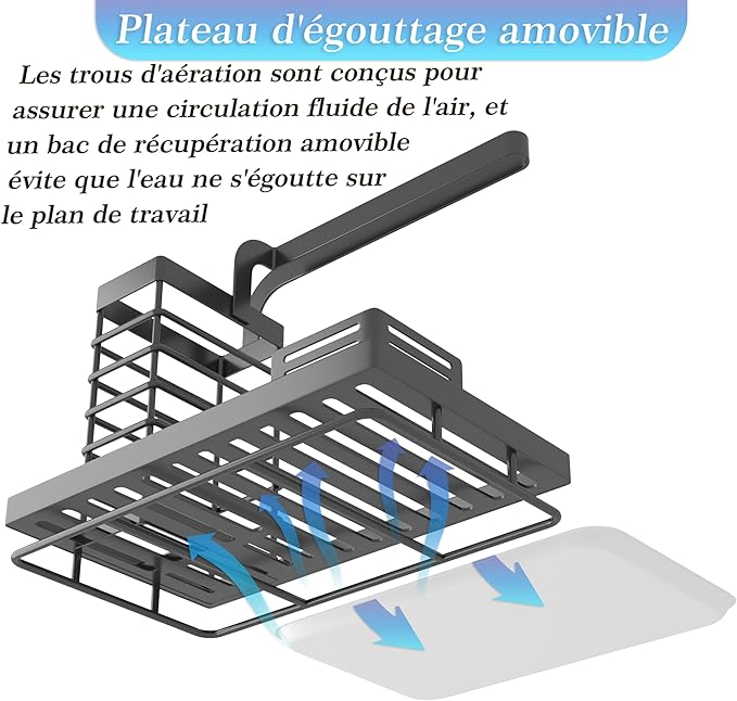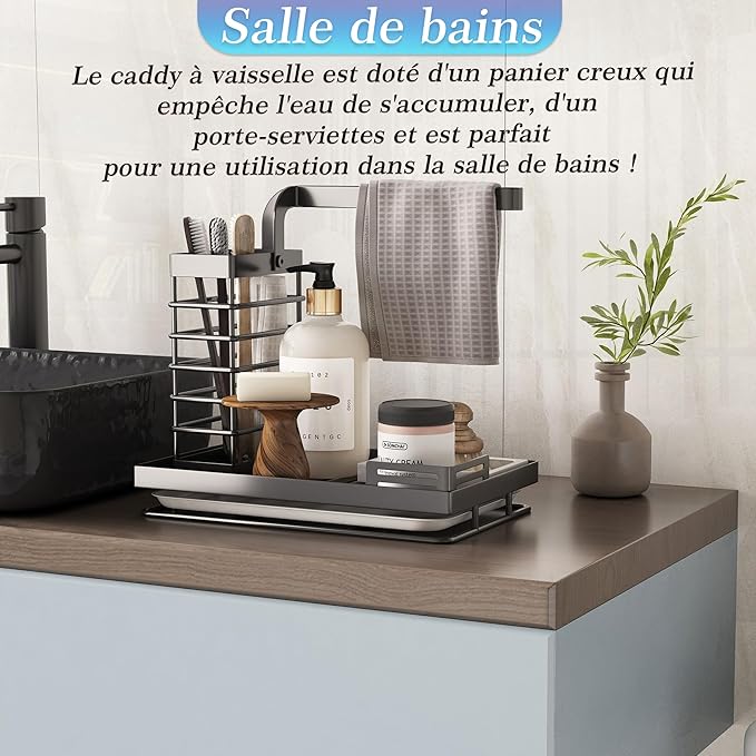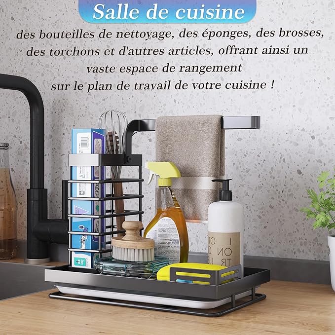 Organisateur pour évier de cuisine en acier inoxydable, incluant un porte-éponge pratique et une étagère avec bac d'égouttage. Conçu pour...
