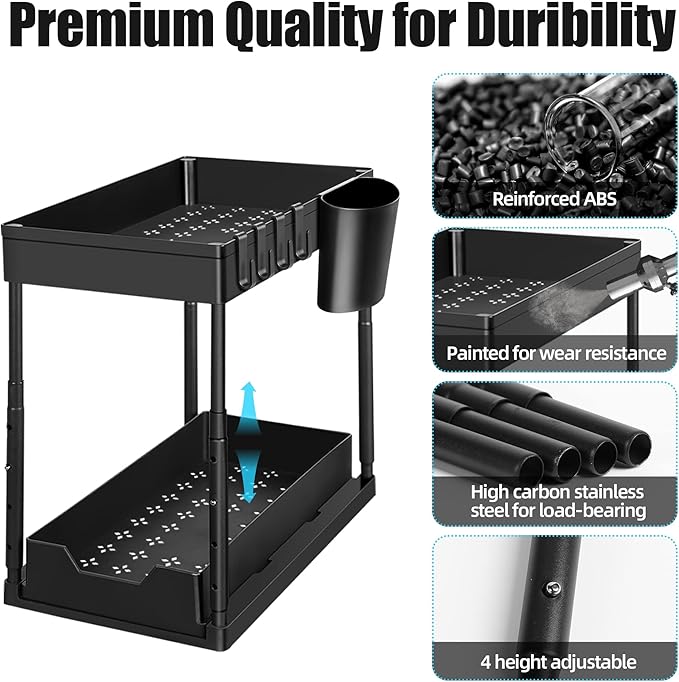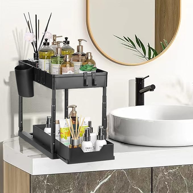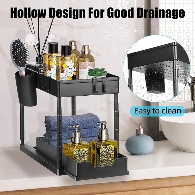 Organisateur sous évier à deux niveaux avec hauteur ajustable, équipé de 4 crochets et 1 tasse.