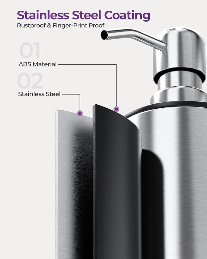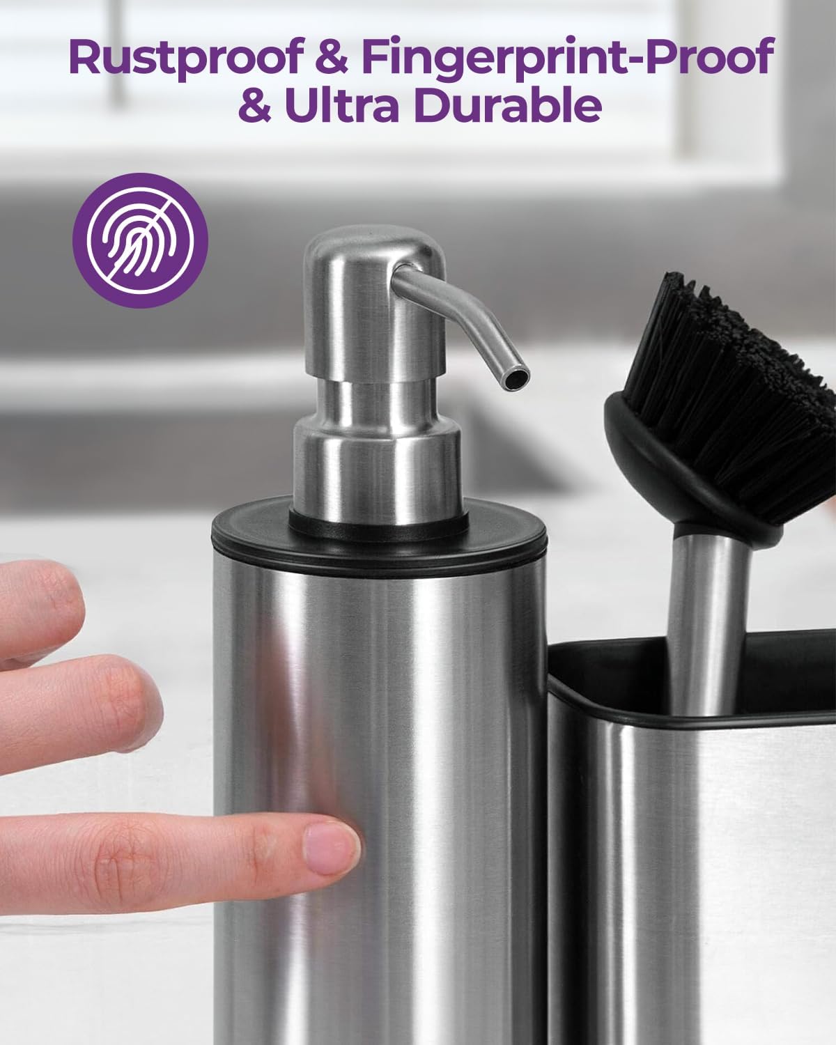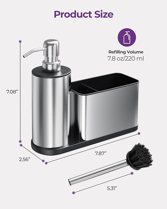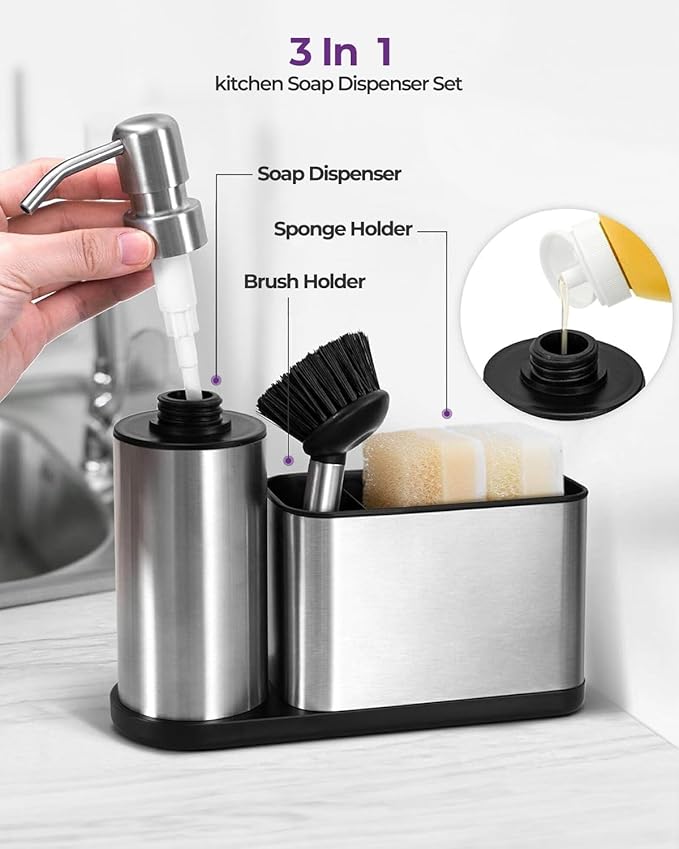 Organiseur d’évier équipé d’un distributeur de savon intégré et d’un support pour éponge, conçu avec une pompe et un bec...