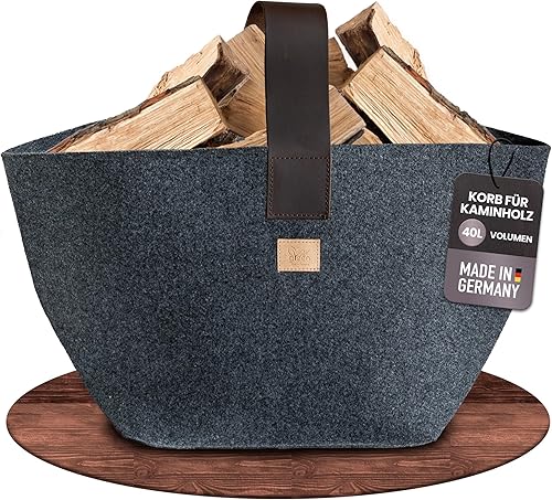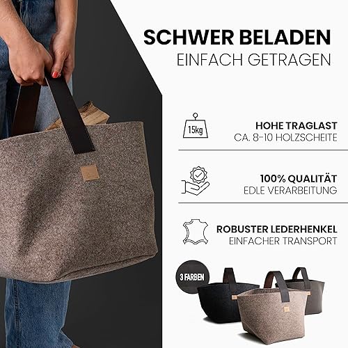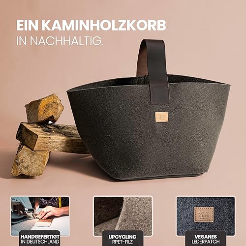 Panier à bois de cheminée au design épuré en feutre d’une capacité de 40 litres – Conçu en Allemagne – Fabrication en feutre rPET issu de l’upcycling avec poignée en cuir véritable – Panier à bois de chauffage robuste et durable.