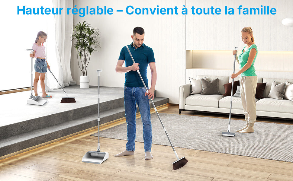 Cet ensemble inclut une balayette à manche long de 146,5 cm avec une tête pivotante à 180° pour un nettoyage facile, une pelle pliable équipée de dents de peigne pour enlever efficacement poils et poussières, ainsi qu’un rouleau anti-peluches fourni avec trois recharges, conçu pour retirer rapidement les poils d’animaux et humains.