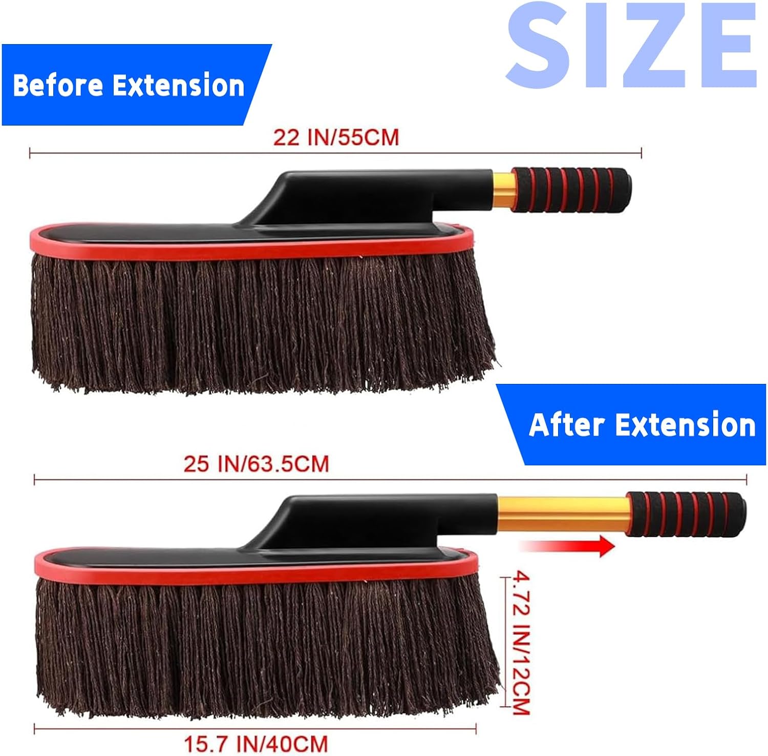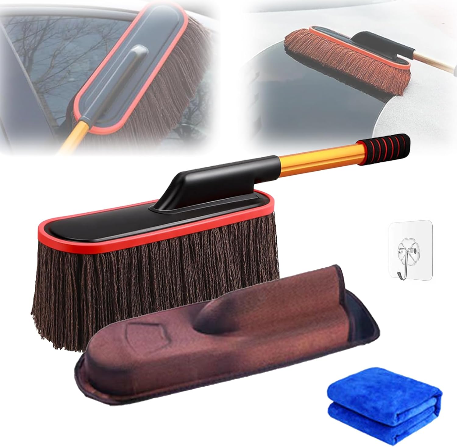 Plumeau de voiture équipé d'une poignée télescopique extensible, brosse rotative pour un nettoyage efficace, et chiffon anti-rayures, idéal pour SUV, camions, camping-cars et utilisation en garage.
