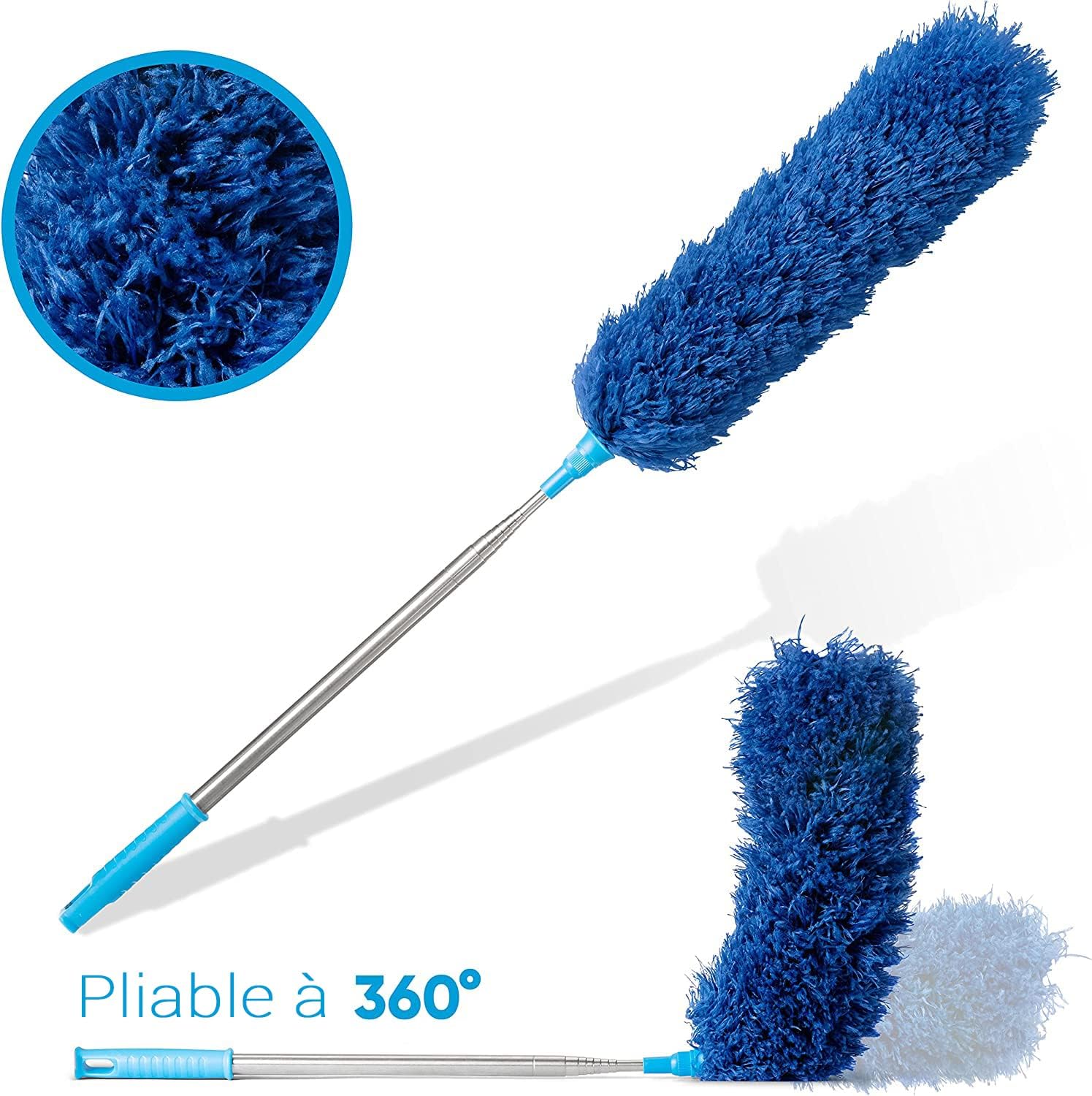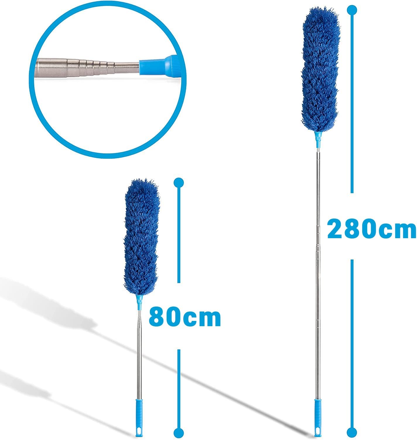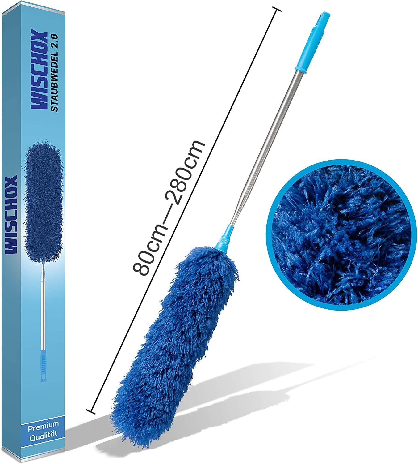 Plumeau télescopique WISCHOX Premium avec microfibre lavable, tige réglable de 40 à 280 cm, idéal pour retirer les toiles d’araignée, attrape la poussière efficacement, nettoyeur extensible bleu.