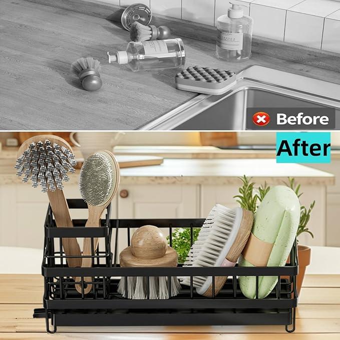 Ce porte-éponge en acier inoxydable noir comprend un porte-brosse et un séparateur amovibles pour organiser facilement votre évier.