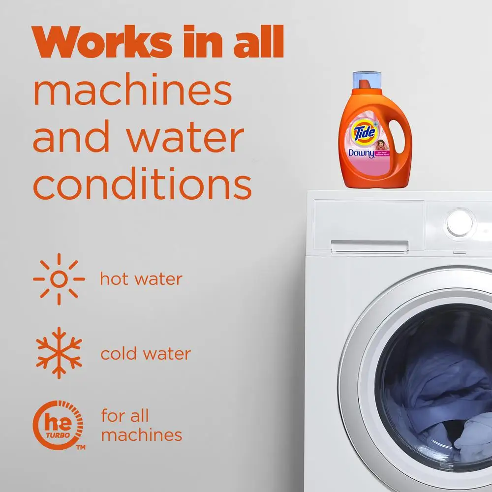 Tide + Downy liquid detergent offers Tide's powerful cleaning and freshness plus the color protection of Downy.    Loaded with softening ingredients that add a smooth layer of comfort to the fibers in your fabrics.    With a more concentrated formula, you get more cleaning agents and less water in every drop.  *vs.  previous formula   Works in laundry loads for both HE and non-HE washing machines.    Part of the trusted Tide Plus Collection.    From America's #1 detergent brand* (*Tide, based on sales)   84 fl oz, 59 loads