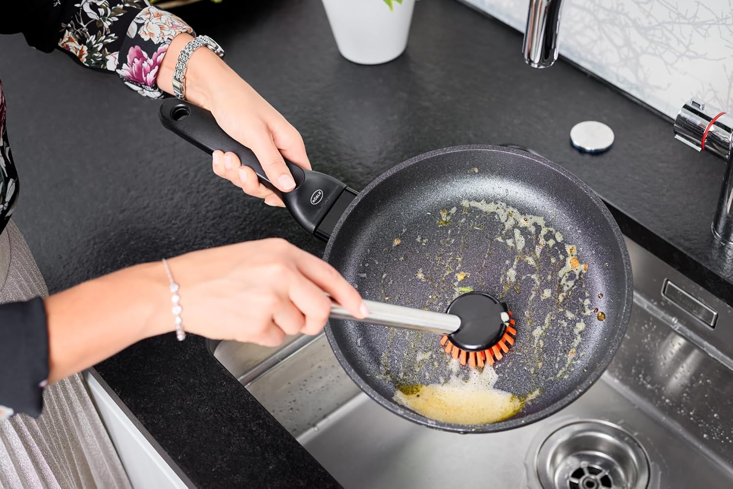 La brosse à vaisselle antibactérienne RÖSLE est dotée d’une tête interchangeable, conçue en acier inoxydable 18/10 et équipée de poils en polyester durables. Elle est également compatible avec le lave-vaisselle pour un entretien facile.
