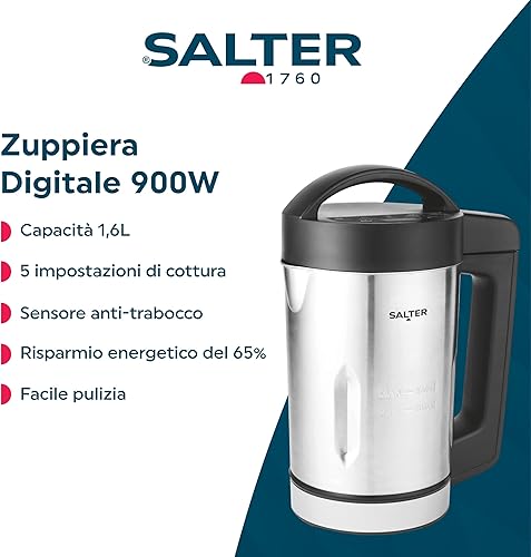 La Salter EK5118V2 est une machine numérique à soupe alliant grande capacité et performance rapide. Avec son bol généreux de 1,6 litre, elle permet de préparer en quelques minutes des soupes chaudes, idéales pour les foyers actifs et les palais variés.