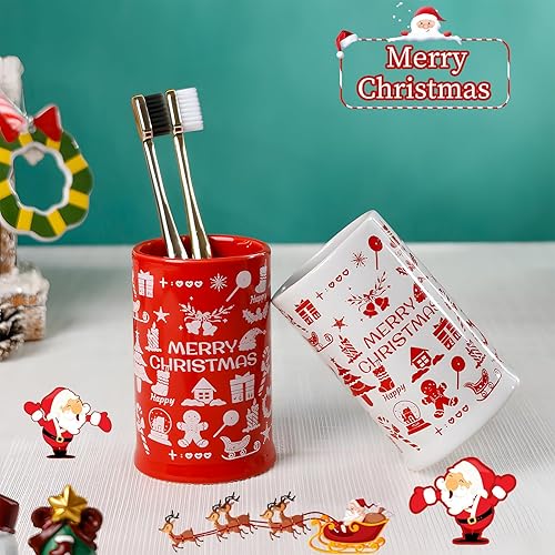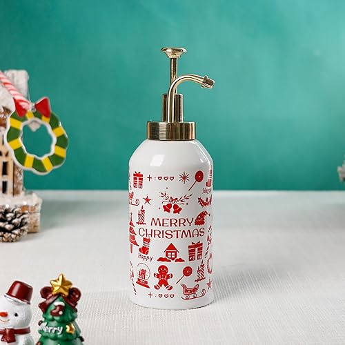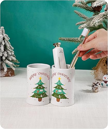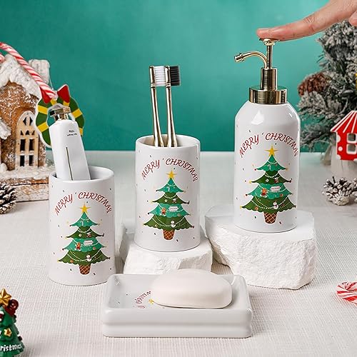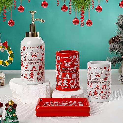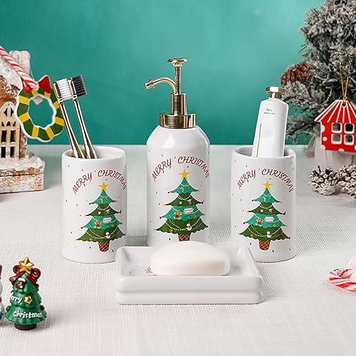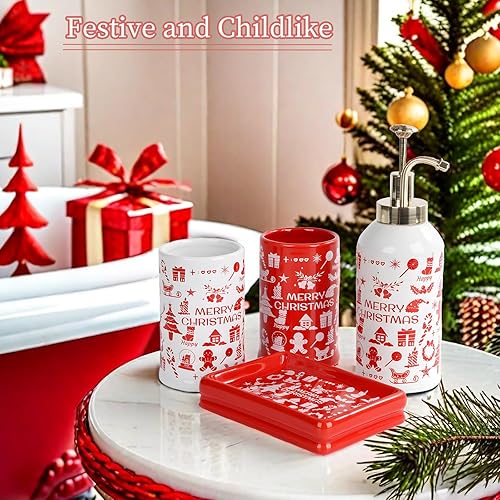 Santentre propose un ensemble de 4 accessoires de salle de bain sur le thème de Noël, incluant un distributeur de savon, un porte-brosse à dents, un gobelet et un porte-savon en céramique, alliant esthétique raffinée et utilité pratique.