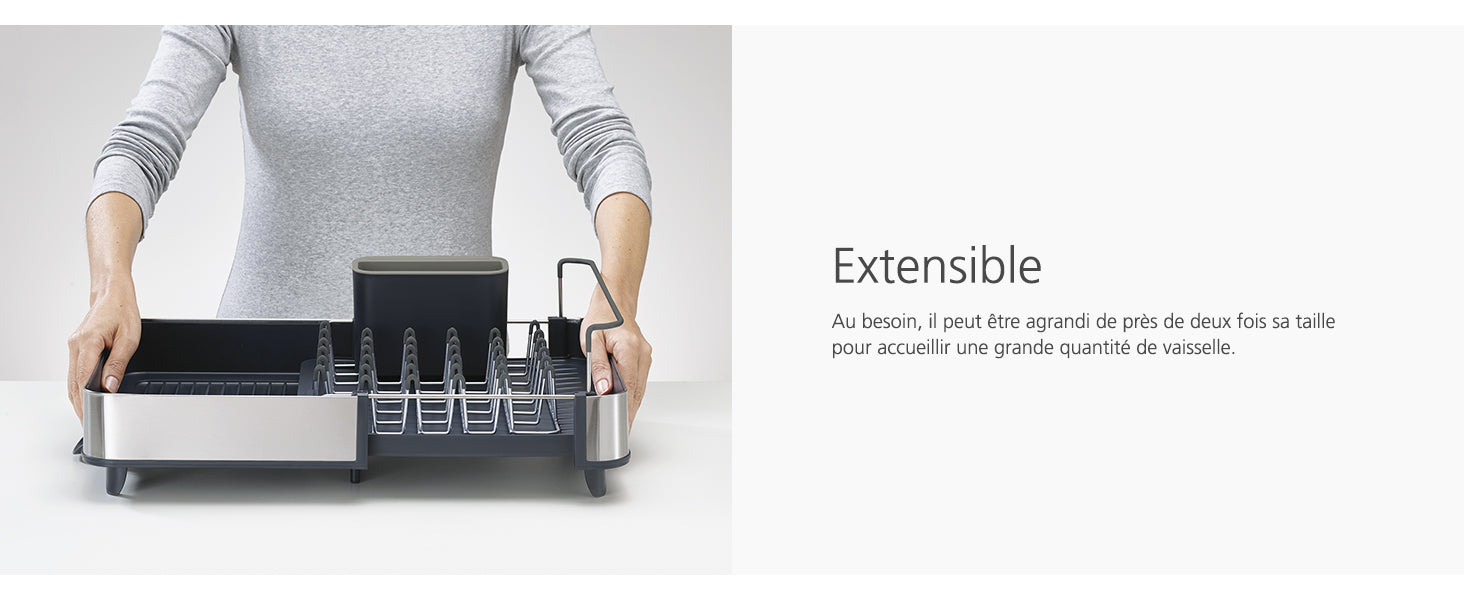 Ce séchoir à vaisselle extensible en acier s’adapte selon vos besoins pour accueillir davantage d’ustensiles.