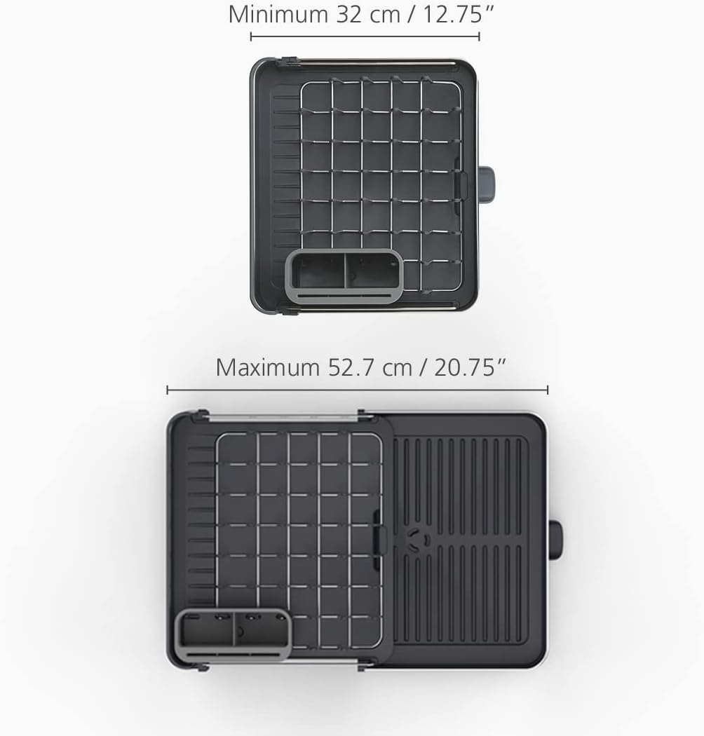 Séchoir à vaisselle extensible en acier inoxydable avec compartiment à couverts amovible et bec d'égouttage pivotant pour un séchage pratique et efficace.