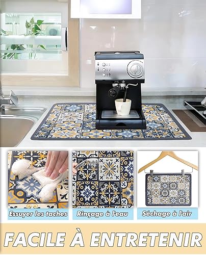 Avec des dimensions de 60 x 40 cm, ce tapis offre un espace généreux pour sécher vaisselle, verres ou petits ustensiles, tout en restant facilement ajustable à la taille désirée.