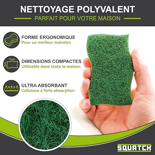Conçues pour résister à tout, les éponges SQUATCH® possèdent une double couche : un côté vert pour un récurage efficace des taches tenaces, et un côté jaune en cellulose non abrasive pour un nettoyage doux sans rayures.