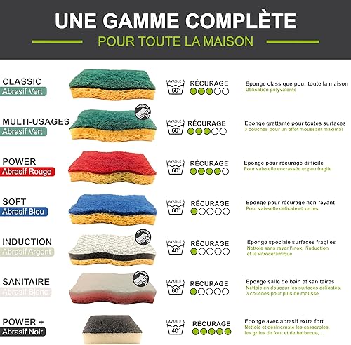 Résistantes et durables, elles conservent leur forme même après avoir frotté des aliments incrustés. Polyvalentes, elles conviennent aussi bien à la vaisselle qu’aux surfaces de la cuisine et de la salle de bain.