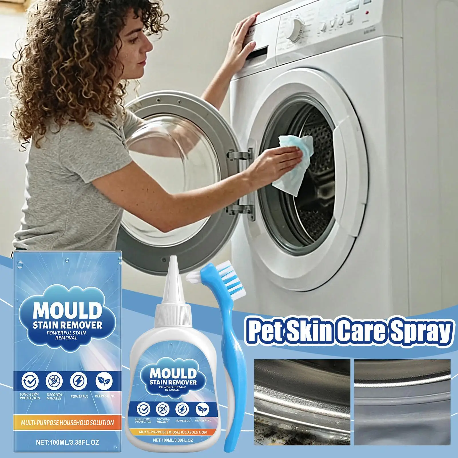 Washing Machine Mold Remover Gel is a powerful cleaning solution designed for deep cleaning and descaling household surfaces and appliances. This heavy-duty gel effectively remove stains and grime from washing machines, laundry areas, dishwashers, bathtubs, tiles, grout, sinks, showers, toilets, and kitchens. Its active formula ensures thorough cleaning while being suitable for various household uses. Restore cleanliness and hygiene to your home with this versatile cleaner that targets hard-to-reach areas and eliminates buildup. Ideal for maintaining a well-maintained and sanitary environment in every corner of your living space.