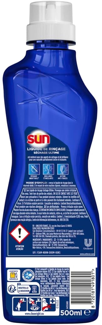 SUN - Liquide de Rinçage pour Lave-Vaisselle - Assure une vaisselle jusqu’à 8 fois plus sèche et double la brillance. Il limite également les traces de calcaire pour un résultat impeccable. Format 500 ml.
