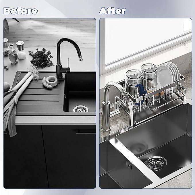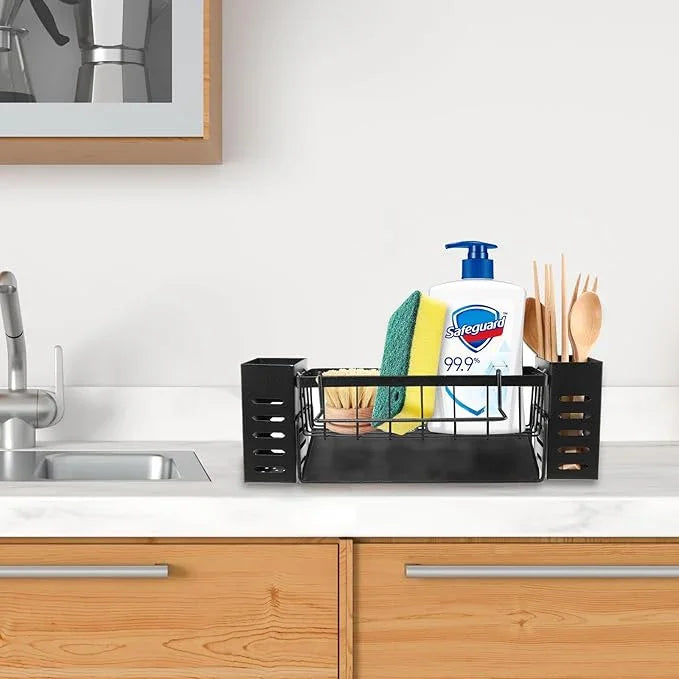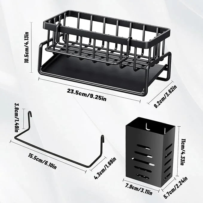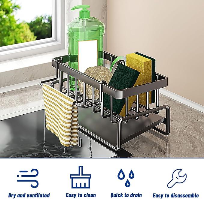 Support éponge pour évier de cuisine équipé d'un bac de drainage automatique, d'un porte-serviettes amovible et d’un compartiment de rangement... En savoir plus